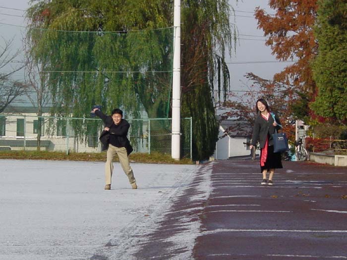 운동장이 꽁꽁 얼어붙어서 스케이트 타는 흉내를 내는 조현룡선생님과